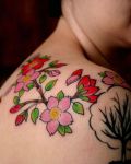 Shoulder tattoo with three flowers. One have pink petals, second is purple and the last is blue.